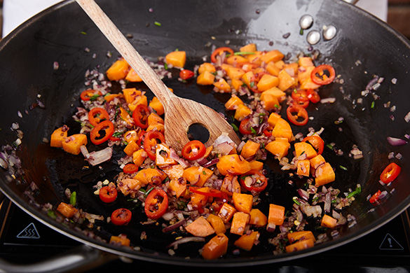 Die Peperoni in feine Scheiben schneiden. Wer es nicht ganz so scharf möchte, verwendet nur 1/3 der Schote und entfernt die Kerne. In einer großen Pfanne 1EL Öl mittelhoch erhitzen, darin die Zwiebeln, Korianderstiele, Karotten und Peperoni ca. 4-6Min. braten, bis sie weich und leicht gebräunt sind. Mit Salz und Pfeffer würzen.