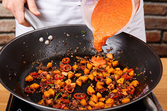 Sobald das Gemüse angeschwitzt ist, das Ras el Hanout hinzugeben und 1Min. mitdünsten. Das Paprikapüree hinzugeben und alles 8-10Min. einköcheln, bis die Sauce etwas angedickt ist. Zum Schluss evtl. nochmals abschmecken.