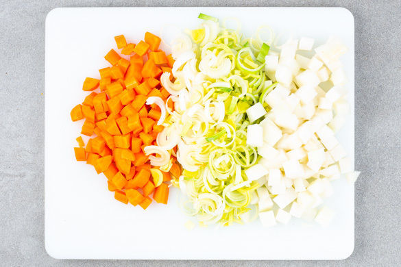Den Lauch längs halbieren und in feine Streifen schneiden. Die Karotten schälen, längs vierteln und in kleine Würfel schneiden. Den Kohlrabi schälen und ebenfalls in kleine Würfel schneiden.