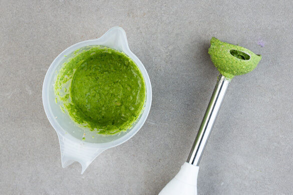 In einem großen Topf ausreichend gesalzenes Wasser für die Pasta zum Kochen bringen. Den Knoblauch schälen, grob würfeln und mit der ½ des Spinats, den Walnüssen, den Hefeflocken, 3–4EL Kochwasser, 2EL Olivenöl und 2EL Essig in einem hohen Gefäß mit einem Stabmixer möglichst glatt pürieren. Die Basilikumcreme unterrühren.
