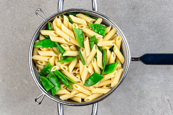 Die Kaiserschoten quer halbieren und in ein Sieb geben. Etwas Pastawasser abschöpfen, dann die Pasta auf die Kaiserschoten in das Sieb abgießen und abtropfen lassen.
