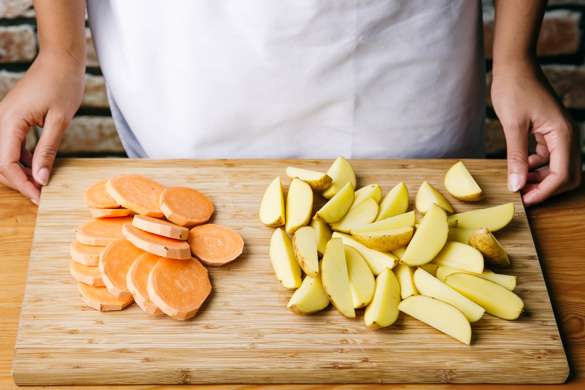 Den Backofen auf 200°C (180°C Umluft) vorheizen. Die Kartoffeln samt Schale in Spalten schneiden. Die Süßkartoffeln schälen und in ca. 0,5cm dünne Scheiben schneiden.