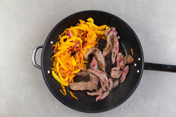 Das Fleisch trocken tupfen, zu dem Gemüse in die Pfanne geben und bei starker Hitze 3–5Min. braten, je nachdem, ob es medium oder durch sein soll. 2EL Wasser dazugeben und mit Salz und Pfeffer abschmecken.