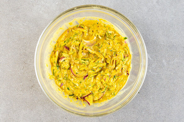 Die Maisstärke mit 75g Mehl, der Garam-Masala-Gewürzmischung, 1TL Salz und 1 kräftigen Prise Pfeffer vermengen. 250g Wasser zugeben und alles mit einem Schneebesen zu einem glatten Teig verrühren, dann die Zwiebeln und die Zucchini untermengen.