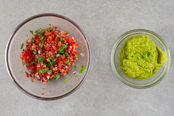 Die übrigen Zwiebeln mit der ½ des Limettensafts, 1EL Olivenöl und 1 kräftigen Prise Salz vermengen. Die Tomaten und die geschnittenen Korianderblätter untermengen. Die Salsa ggf. mit mehr Salz abschmecken. Die Guacamole nach Geschmack mit der Limettenschale verfeinern.