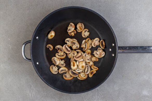 In einem mittelgroßen Topf ausreichend gesalzenes Wasser für die Pasta zum Kochen bringen. Die Pilze mit 1 Prise Salz in einer großen Pfanne mit 1EL Olivenöl bei mittlerer Hitze 3–4Min. braten.