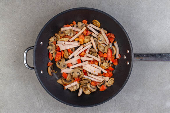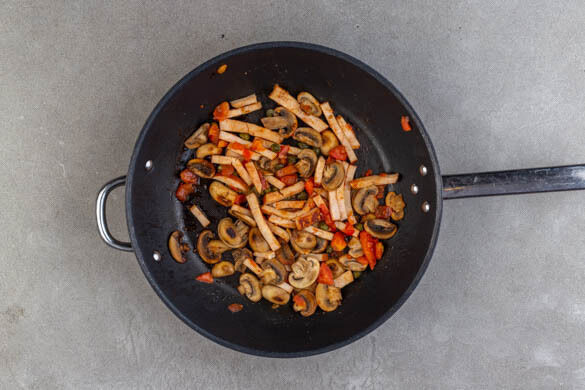 Die geräucherten Hähnchenstreifen und die Tomaten zu den Pilzen in die Pfanne geben und 3–4Min. mitbraten.