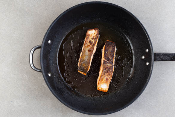 Den Fisch in derselben Pfanne mit 1EL Olivenöl bei mittlerer Hitze 3–4Min. auf der Hautseite braten. Mit 1 kräftigen Prise Salz würzen, wenden und 1–2Min. auf der anderen Seite braten, bis er gar ist. Den Fisch auf Teller verteilen, mit dem Linsensalat und den Nektarinenspalten anrichten und mit dem Tahinidressing beträufelt servieren.