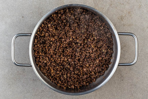 In einem mittelgroßen Topf 1L Wasser zum Kochen bringen. Die Linsen in einem Sieb mit kaltem Wasser abspülen, abtropfen lassen und in das kochende Wasser geben. Die Linsen bei mittlerer bis niedriger Hitze abgedeckt 18–20Min. köcheln lassen, bis sie gar, aber noch bissfest sind. In ein Sieb abgießen und kalt abspülen, dann zurück in den Topf geben.