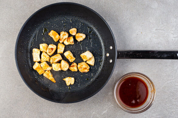 Die Schnetzel in einer mittelgroßen Pfanne mit 1EL Olivenöl bei mittlerer bis starker Hitze in 6–8Min. goldbraun anbraten, dabei gelegentlich wenden. Die BBQ-Sauce mit 50ml Wasser, 1TL Honig und 1EL Essig zu einer dünnflüssigen Sauce verrühren.