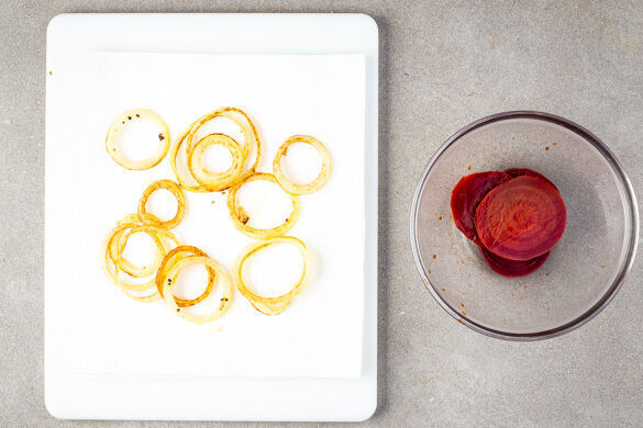 Die Zwiebelringe in einer großen Pfanne mit 4EL Olivenöl bei mittlerer Hitze auf jeder Seite 2–3Min. knusprig braten und auf etwas Küchenkrepp abtropfen lassen. Die Rote Bete in ein Sieb abgießen und abtropfen lassen.