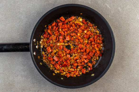 Die Eier mit ½TL Salz und 1 kräftigen Prise Pfeffer verquirlen. Die Zwiebeln in 2 mittelgroßen ofenfesten Pfanne mit je 1EL Olivenöl bei mittlerer bis starker Hitze in ca. 2Min. glasig anbraten. DieChorizo auf die Pfannen verteilen und weiterbraten, bis die Zwiebeln und die Chorizo zu bräunen beginnen.