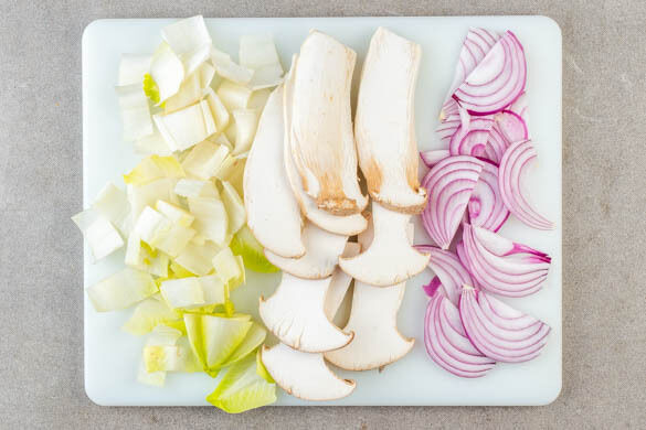 Den Backofen auf 220°C (200°C Umluft) vorheizen. Die Zwiebeln schälen, halbieren und in feine Streifen schneiden. Den Chicorée quer in ca. 2cm dicke Streifen schneiden, dabei den Strunk entfernen. Die Pilze längs in ca. 0,5cm breite Scheiben schneiden.