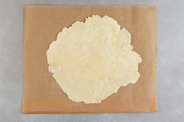 Den Backofen auf 220°C (200°C Umluft) vorheizen. Die Teige vorsichtig ausrollen und mit dem Backpapier nach unten auf zwei Backbleche legen.