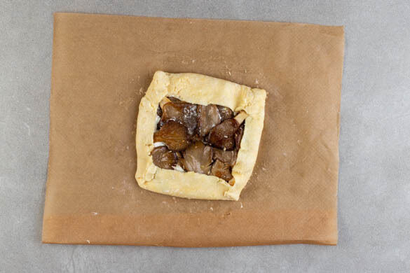 Die Teige gleichmäßig mit der Ziegenkäsecreme bestreichen, dabei rundum ca. 2cm am äußeren Rand frei lassen. Die Pilze auf der Creme verteilen und den Teigrand über die Pilze falten.