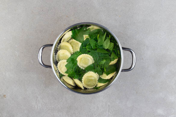Die Pasta in das kochende Wasser geben und in ca. 4Min. bissfest kochen. Inzwischen den Spinat gründlich waschen. Den Topf vom Herd nehmen und den Spinat unterrühren und zusammenfallen lassen. Mit einer Tasse etwas Pastawasser abschöpfen, dann die Pasta und den Spinat in ein Sieb abgießen und abtropfen lassen.