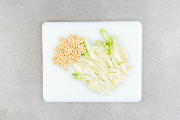 Den Backofen auf 200°C (180°C Umluft) vorheizen. Den Fenchel längs halbieren und in ca. 1cm dünne Scheiben schneiden. Die Haselnüsse fein hacken.