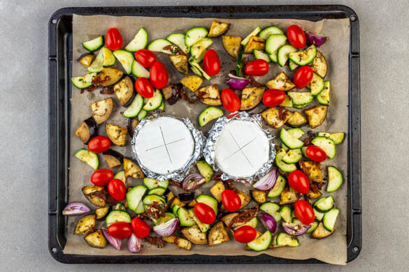 Die Camemberts auf der Oberseite kreuzweise einschneiden, dann jeweils in etwas Alufolie einschlagen, die oberen Seiten aber offen lassen. Die Zucchini und die Zwiebeln auf den Blechen mit den Auberginen vermengen, den Käse dazulegen und die Tomaten drumherum verteilen. Noch 10–15Min. im Ofen backen, bis der Käse weich und das Gemüse gar ist.