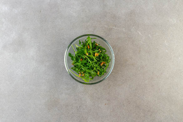 Die ½ der Tomaten-Würze mit den Auberginen vermengen. Die Auberginen gleichmäßig auf zwei mit Backpapier ausgelegten Blechen verteilen und ca. 10Min. im Ofen rösten. Inzwischen die Pinienkerne in einer mittelgroßen Pfanne ohne Zugabe von Fett bei mittlerer Hitze in 1–2Min. goldbraun anrösten. Zum Abkühlen aus der Pfanne nehmen und beiseitestellen.