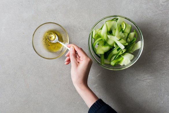 Die Enden der Gurke abschneiden und die Gurke quer in 3 gleich lange Stücke schneiden. Die Gurke mit einem Sparschäler rundum in feinen Streifen abschälen, das Kerngehäuse aussparen. Für das Dressing 1EL Olivenöl mit 2EL Essig sowie Salz, Pfeffer und 1 Prise Zucker verrühren.
