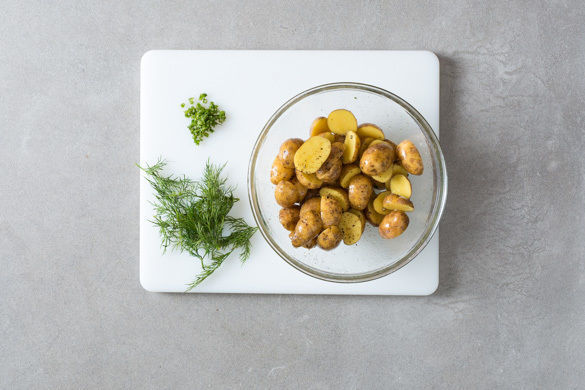 Die Kartoffeln halbieren oder vierteln und mit 1TL Olivenöl sowie Salz und Pfeffer vermengen. Neben der Roten Bete auf das Backblech geben und 15–20Min. im Ofen backen. Die Dillspitzen abzupfen, die Dillstängel sehr fein schneiden.