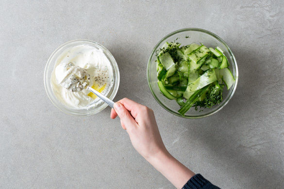 Die Dillspitzen fein schneiden, ca. 2EL unter die Gurken mengen. Den Quark mit den Dillstielen verrühren und mit 1TL Olivenöl sowie Salz, Pfeffer und 1 Prise Zucker verfeinern.