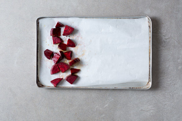 Den Backofen auf 210°C Umluft (230°C Ober-/Unterhitze) vorheizen. Die Roten Beten schälen und in 2–3cm große Stücke schneiden. Tipp: Am besten Küchenhandschuhe und Schürze tragen, da Rote Bete stark färbt. Auf einer Hälfte eines mit Backpapier ausgelegten Backblechs mit 1EL Olivenöl sowie Salz und Pfeffer vermengen und 20–25Min. im Ofen backen.