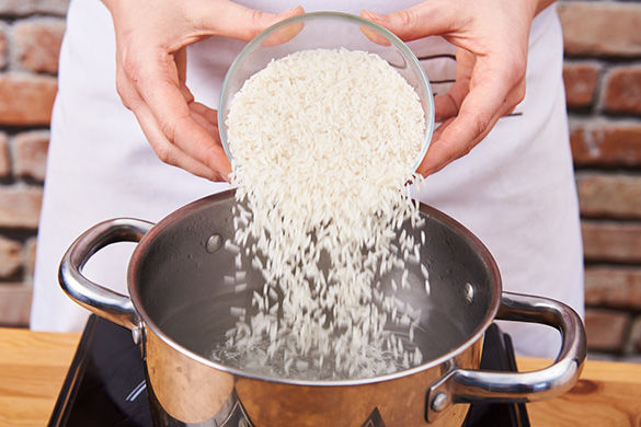 In einem mittelgroßen Topf 800ml leicht gesalzenes Wasser zum Kochen bringen. Den Reis unter fließendem Wasser abspülen, bis das Wasser klar bleibt. Den Reis in das kochende Wasser geben und bei niedrigster Hitze abgedeckt 10–12Min. kochen, bis das Wasser aufgesogen und der Reis bissfest ist. Noch ca. 5Min. ohne Hitzezufuhr abgedeckt ziehen lassen.