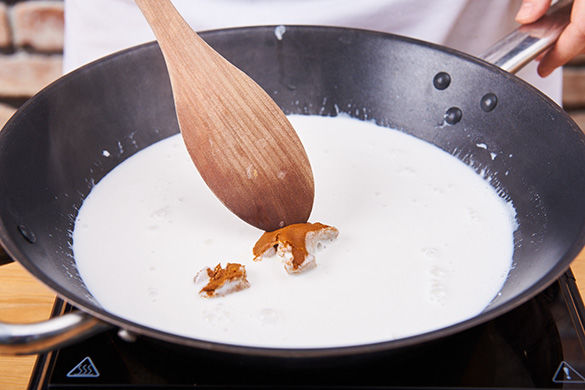 Die Kokosmilch in einer großen Pfanne zum Kochen bringen und die 1/2 der Currypaste unter Rühren darin auflösen. Tipp: Je nach Schärfewunsch kann man einfach mehr oder auch weniger Currypaste verwenden.