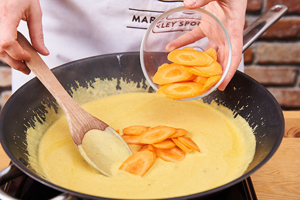 Die Karotten mit in die Pfanne geben und das Curry ca. 5Min. köcheln lassen.