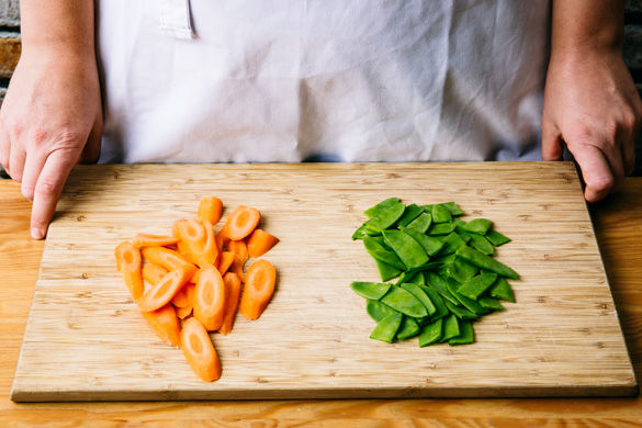 Die Karotten schälen und schräg in dünne Scheiben schneiden. Die Kaiserschoten ggf. von holzigen Enden befreien und schräg halbieren.