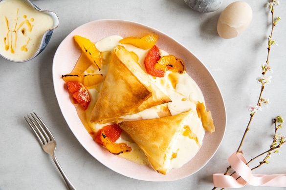 Knusprig gebackener Teig, der eine cremige Quarkfüllung verbirgt, dazu eine feine Vanillesauce und karamellisierte Grapefruit- und Orangenstücke – da müssen wir gar nicht viel mehr zu sagen: Das schmeckt einfach himmlisch!