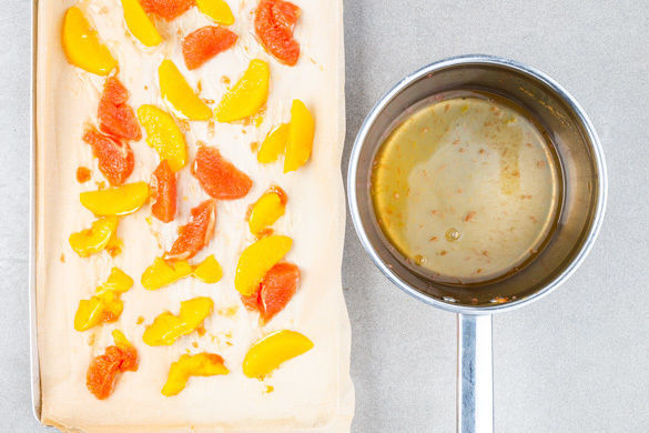 1/2TL Grapefruitschale abreiben. Die Grapefruit und die Orange schälen, die Segmente auslösen, dabei den Saft auffangen. Diesen mit Wasser auf 100ml auffüllen und mit 100g Zucker aufkochen. Das Obst bei niedriger Hitze 1Min. dazugeben, dann mit einer Schaumkelle herausheben und auf ein mit Backpapier belegtes Backblech geben. Das Zuckerwasser weiter köcheln lassen.