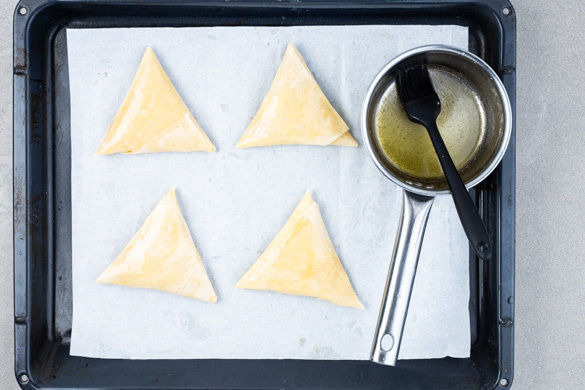 Den Teig mit dem Papier nach unten ausrollen, dünn mit Butter bepinseln und von der langen Seite aus in 4 gleich große Streifen schneiden. Jeden Streifen an einem Ende diagonal nach oben klappen und das entstandene Stück diagonal nach unten klappen. Die entstandene Tasche mit 2–3EL Quark füllen, den Teig über der Öffnung umklappen und das Dreieck verschließen.