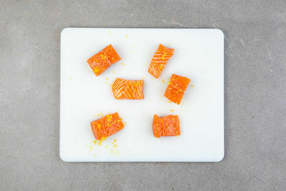 Den Lachs mit kaltem Wasser abspülen, trocken tupfen und in 15–18 gleich große Stücke schneiden, dabei evtl. vorhandene Gräten und die Haut entfernen. Mit der ½ der Zitronenschale und 3EL Olivenöl einreiben.