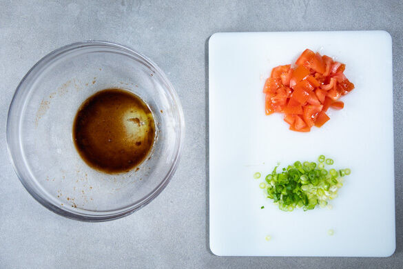 Die Pilze nach Geschmack mit Salz und Pfeffer würzen und vom Herd nehmen. Die Tomate grob würfeln und die Lauchzwiebel in feine Ringe schneiden. Den restlichen Knoblauch, 1TL Olivenöl und ½TL Balsamicoessig zu einem Dressing verrühren.