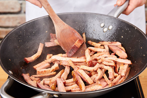 In einer großen Pfanne 1-2EL Pflanzenöl mittelhoch erhitzen und die Kasslerstreifen ca. 3-4Min. knusprig braten. Aus der Pfanne nehmen und auf einem Küchenkrepp abtropfen lassen.