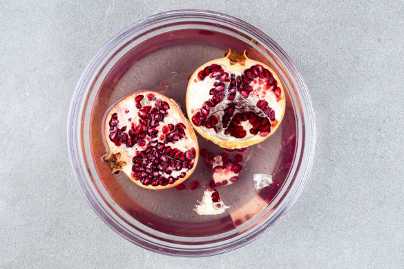 Den Granatapfel halbieren und über einer mit Wasser gefüllten Schüssel aufbrechen. Die Granatapfelkerne unter Wasser aus den Fruchtwänden und Häutchen lösen. Das Pulen im Wasser verhindert, dass sich Granatapfelsaft in der Küche verteilt. Die schwimmenden Häutchen mit einem Löffel abschöpfen, dann die gepulten Granatapfelkerne in ein Sieb abgießen.