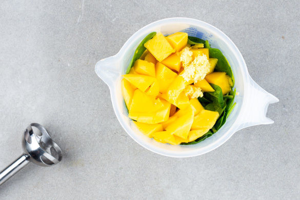 Die Mangowürfel, den Ingwer und den Spinat mit 400ml Wasser in einem hohen Gefäß mit einem Stabmixer 3–5Min. pürieren. Tipp: Wer mag, kann auch Kokoswasser oder kalten grünen Tee verwenden. Den Smoothie zu den Frühstücksflocken servieren.