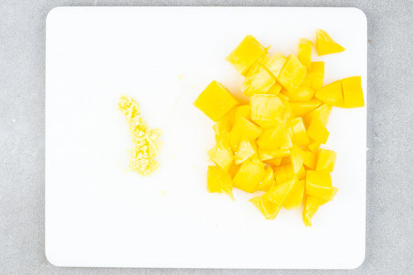 Für den Smoothie die Mango schälen, das Fruchtfleisch um den Kern herum abschneiden und in Würfel schneiden. Den Ingwer schälen und fein reiben.