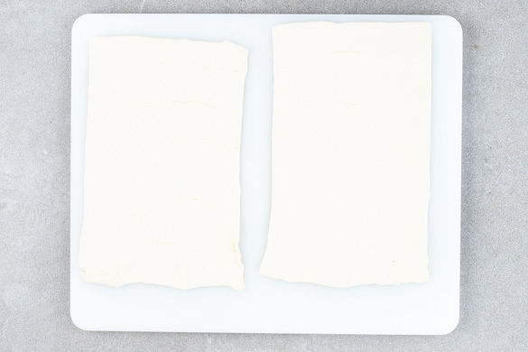 Den Backofen auf 220°C Umluft (240°C Ober-/Unterhitze) vorheizen. Den Blätterteig längs halbieren und 1 Hälfte nochmals quer halbieren. Tipp: Die andere Hälfte wird für dieses Rezept nicht benötigt, kann aber eingefroren werden.