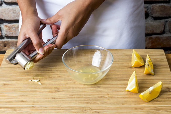 Die Zitrone halbieren, eine Hälfte auspressen, die andere Hälfte in Spalten schneiden. Den Knoblauch schälen und sehr fein würfeln oder durch eine Knoblauchpresse drücken.