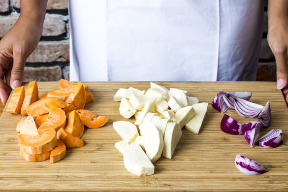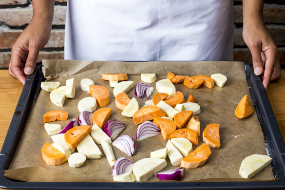 Den Backofen auf 200°C Umluft (220°C Ober-/Unterhitze) vorheizen. Die Süßkartoffel und die Pastinaken schälen, halbieren und in 1–2cm dicke Scheiben schneiden. Die Zwiebeln schälen, halbieren und in Spalten schneiden.