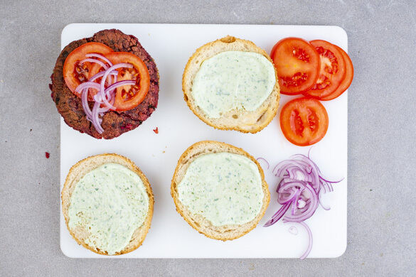2 gleich große Rote-Bete-Pattys formen und diese in einer mittelgroßen Pfanne mit 1EL Olivenöl bei mittlerer Hitze auf jeder Seite 4–5Min. goldbraun anbraten. Dabei nach dem Wenden ggf. etwas flach drücken und die Hitze reduzieren, falls die Pattys zu schnell bräunen. Nebenher die Burgerbrötchen zu den Karotten aufs Blech geben und 4–6Min. aufbacken.