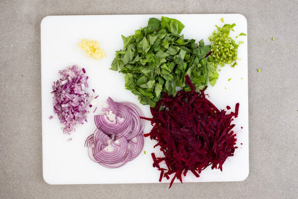 Den Backofen auf 220°C (200°C Umluft) vorheizen. Die Zwiebel schälen und halbieren, eine Hälfte fein würfeln, die andere Hälfte in feine Streifen schneiden. Den Knoblauch schälen und fein würfeln. Die Basilikumblätter und -stängel getrennt fein schneiden. Die Rote Bete schälen und mit einer Küchenreibe grob raspeln, dabei am besten Küchenhandschuhe und Schürze tragen.