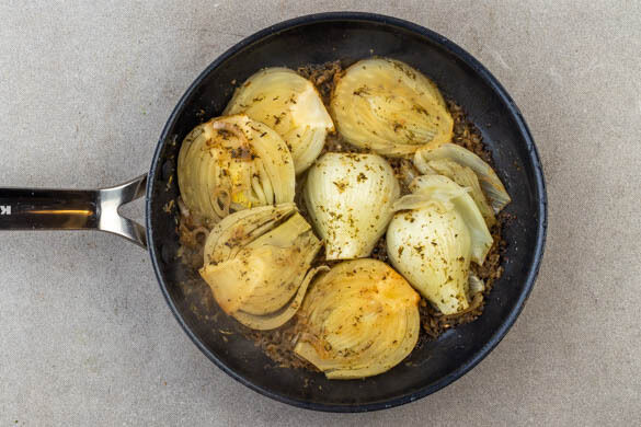 Die Flüssigkeit in der Pfanne zum Kochen bringen und rühren, bis der gesamte Fenchel von Flüssigkeit überzogen ist. Den Fenchel in einer Lage verteilen und abgedeckt bei niedriger bis mittlerer Hitze ca. 15Min. schmoren, bis er zart ist. Dabei nach der Hälfte der Zeit umrühren und den Fenchel wenden.