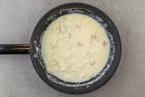 Den Fisch mit der Hautseite nach unten in einer zweiten mittelgroßen Pfanne mit 2TL Olivenöl bei mittlerer Hitze 3–5Min. braten. Mit je 1 Prise Salz und Pfeffer würzen, dann vorsichtig wenden und 1–2Min. weiterbraten. Den Fisch aus der Pfanne nehmen, dann die restlichen Schalotten mit ½EL Butter bei mittlerer Hitze ca. 2Min. braten. ½EL Mehl unterrühren und ca. 1Min. mitbraten.