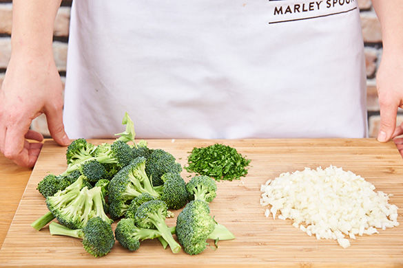 Die Zwiebeln schälen, halbieren und in feine Würfel schneiden. Die Petersilie grob hacken. Den Brokkoli vom Strunk befreien und in 1-2cm kleine Rösschen zerteilen. Die Haselnüsse grob hacken.