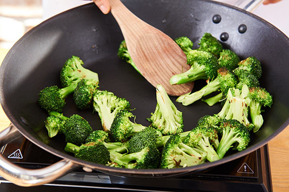 In einer großen Pfanne 1EL Pflanzenöl mittelhoch erhitzen, den Brokkoli darin 2-3Min. anbraten. Nun die Zwiebeln dazugeben und weitere 3-4Min. mitbraten. 2-3EL Wasser hinzufügen und komplett verdunsten lassen. Mit Salz und Pfeffer würzen, aus der Pfanne auf einen Teller geben und für den Moment zur Seite stellen.