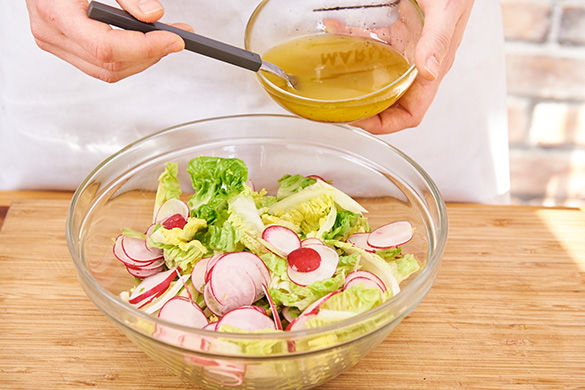 Inzwischen den Salat in mundgerechte Streifen schneiden. Radiesschen in dünne Scheiben schneiden. Aus dem Essig und 3EL Olivenöl sowie etwas Salz, Pfeffer und einer Prise Zucker ein leichtes Dressing herstellen. Den Salat und die Radiesschen mit dem Dressing mischen